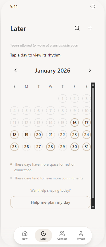 The “Later” view reframes calendar planning as rhythm rather than obligation. Visual density is reduced, and subtle cues communicate which days naturally allow for rest or connection. This shifts planning from filling time to recognizing capacity.