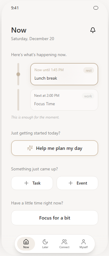 The “Now” view prioritizes situational clarity over task accumulation. Instead of presenting a full day’s workload, the interface surfaces only what is immediately relevant, reinforcing the idea that this is enough for the moment. Language and spacing were intentionally softened to reduce urgency and cognitive load.
