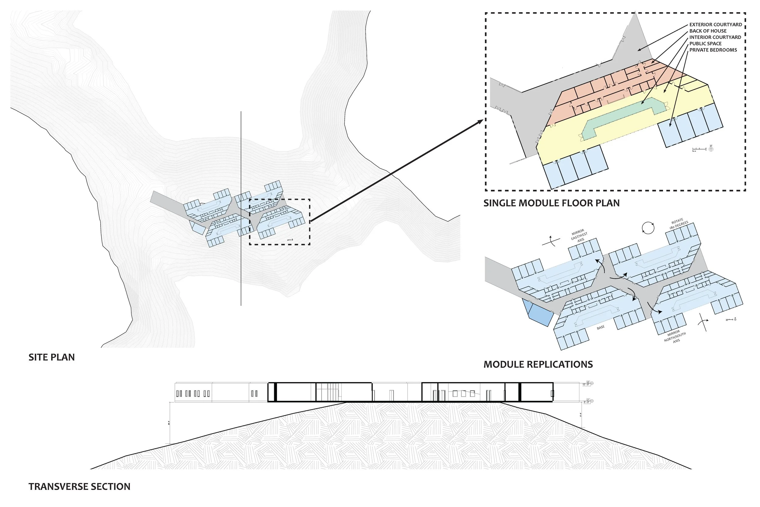 Then, I spent several weeks just reworking the layout until I found one that resonated with the entry sequence and one of my early diagrams. I created this staggered facade approach which aligns all of the residents’ views from their rooms towards the views to the North and the South. I have joined the buildings together to eliminate the exterior courtyards in order to establish enough hill space for interior courtyards that can be used at all times by the residents. This completely solves the issue of finding access to nature and the outdoors and also creates circulation loops for exercise. During this stage, I started to re-program my design and get as many details figured out as I could.
